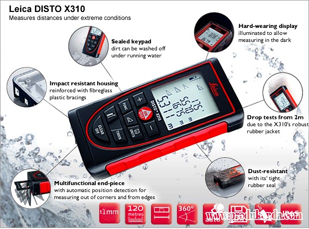 Dengan akurasi pengukuran ± 1.0 mm, Leica DISTO X310 menawarkan presisi tinggi di sentuhan tombol dan dengan besar, layar diterangi hasil pengukuran dan informasi tambahan jelas dan terbaca ditampilkan dan berkat 360 derajat sensor tilt terpadu , dapat mengambil langsung jarak dan ketinggian pengukuran dengan mudah.